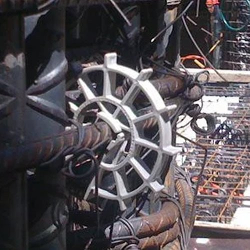 Separador lateral muy fuerte, resistente al impacto, utilizado en pilas pesadas de grandes dimensiones y en muros milímetro de contenció. Colocación al momento de introducir la estructura metálica en la perforación, facilitando el armado de la columna. Ideal en ambientes corrosivos.